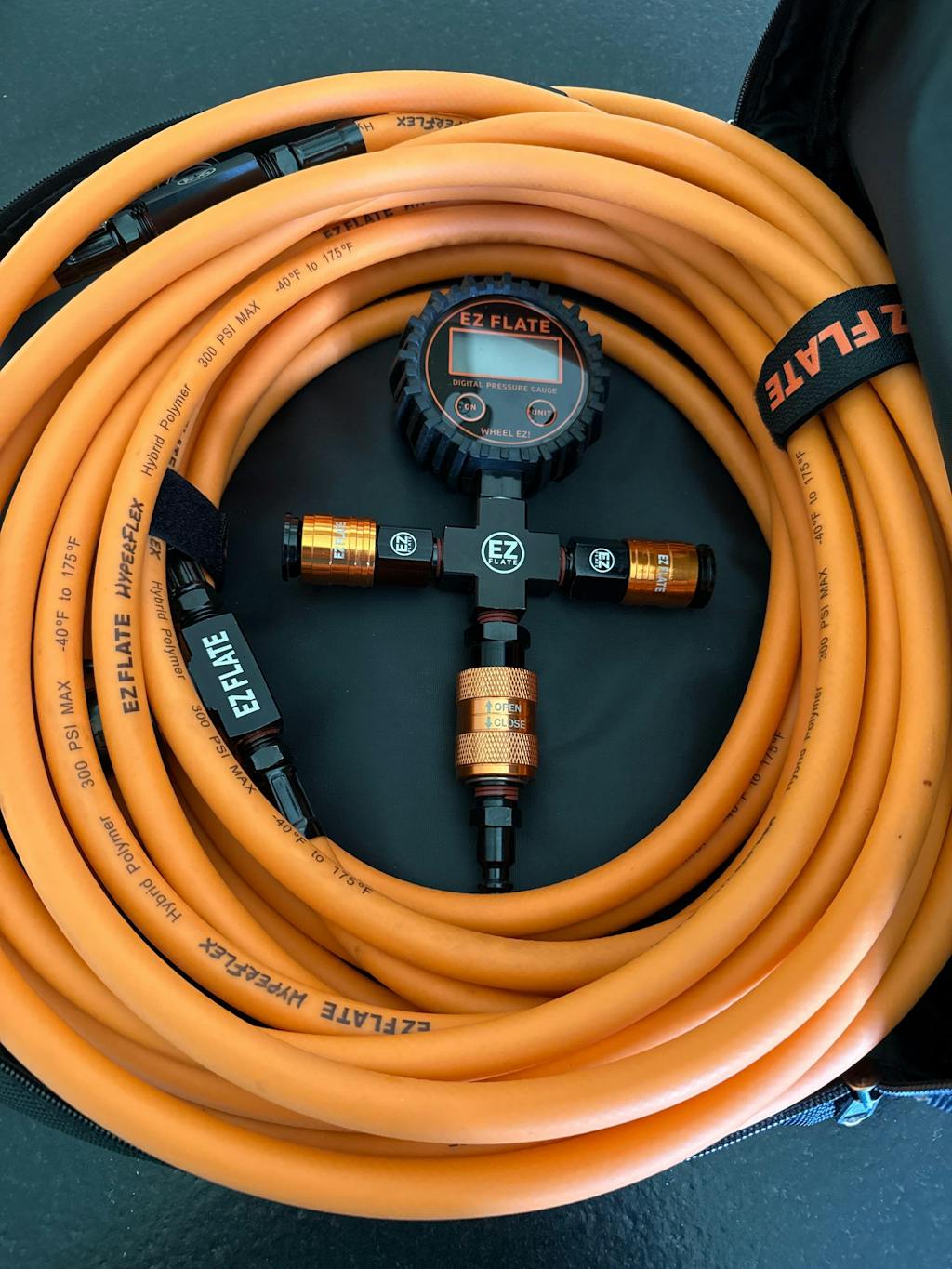 - Velcro straps to hold hose lines up off the ground and keep the coils together in the bag